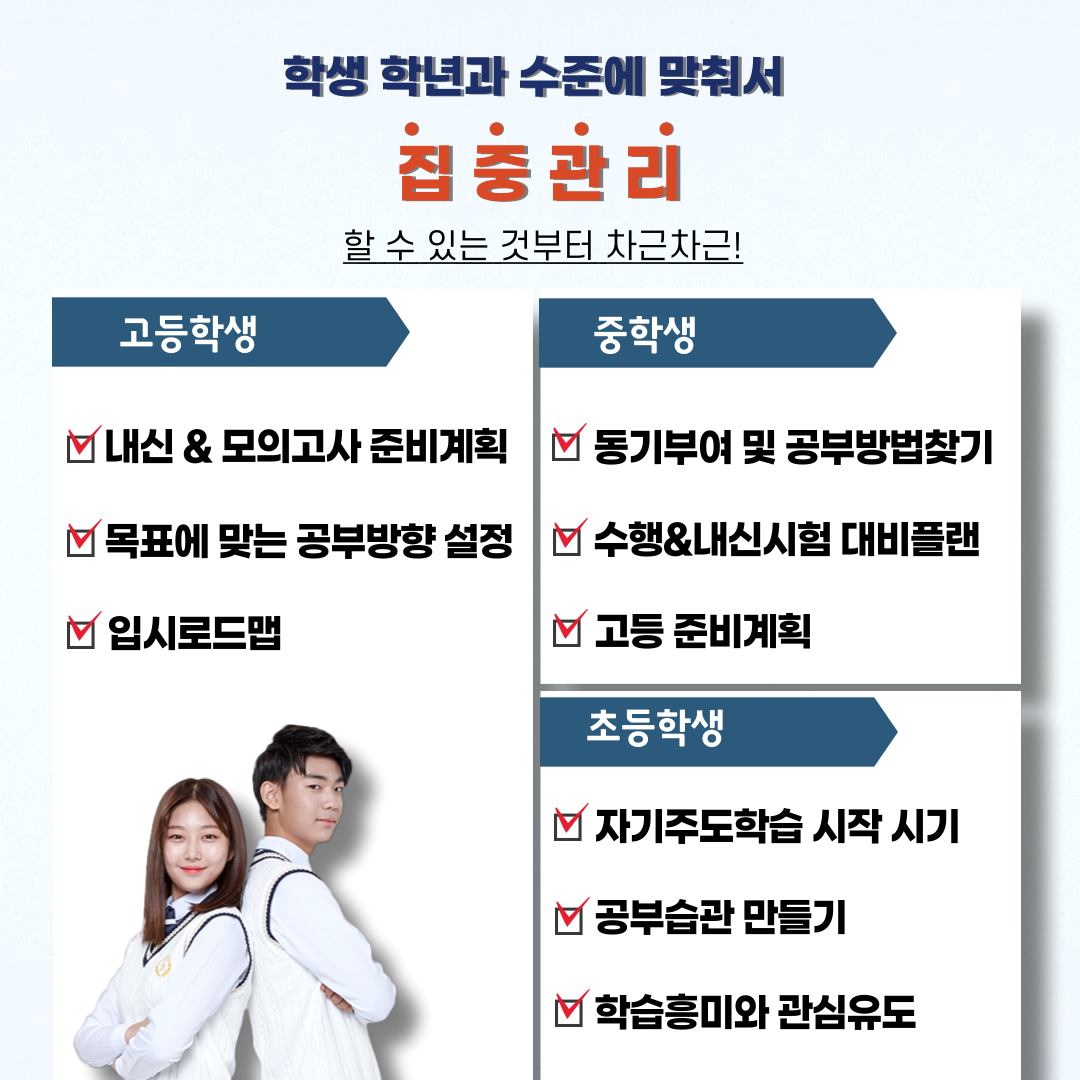저희 학원은 '자기주도학습법'을 알려주어 스스로 공부하는 방법을 가르치고